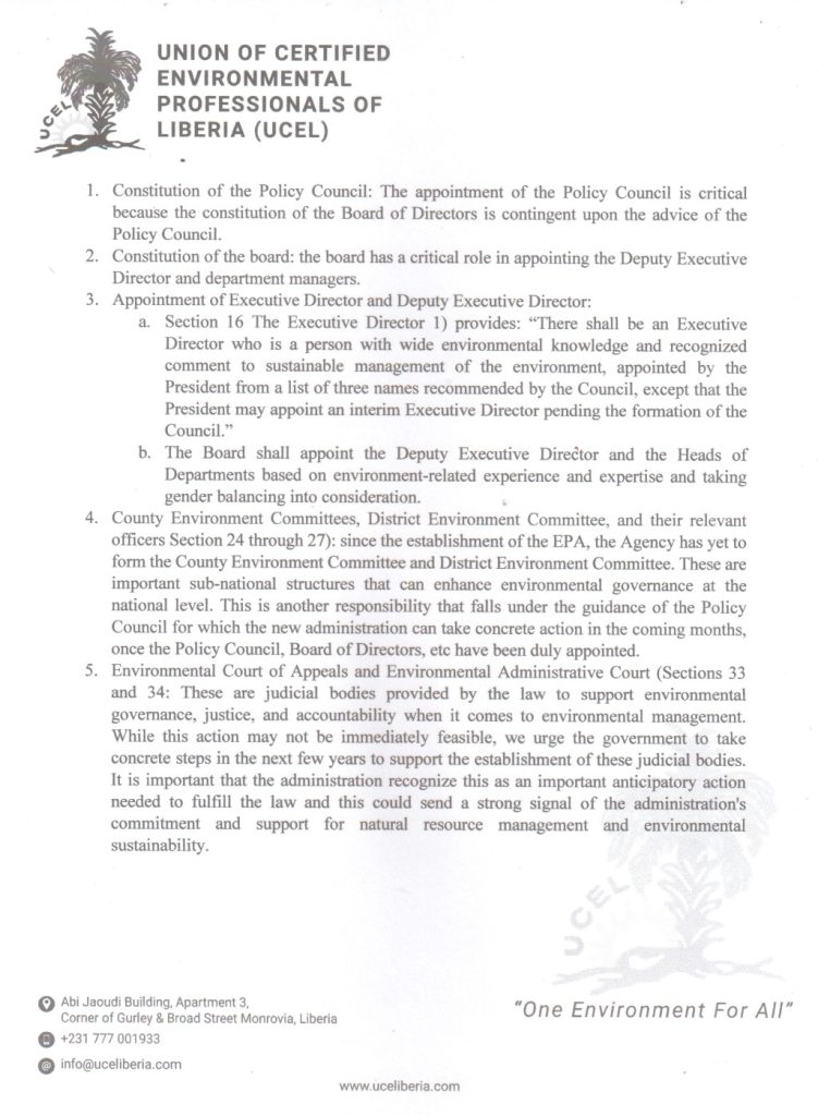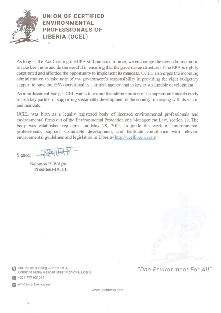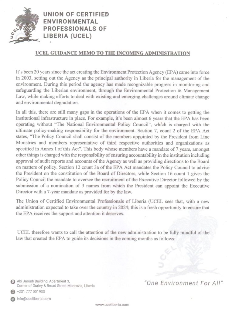 The president of the Union of Certified Environmental Professionals of Liberia, Mr. Solomon P. Wright, has issued a memo to the incoming administration of the UCEL. Find a copy here below;